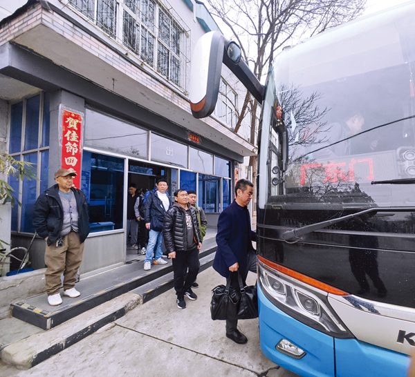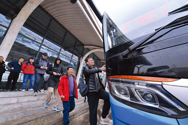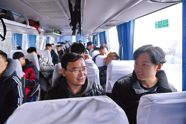 隨著跨省通勤班車路線的增多,郭佳寧(右一)等跨省通勤職工的生活也更加便利。他往返京冀的周期從12天縮減至了7天。圖為郭佳寧和同事們從首鋼京唐公司返回北京。