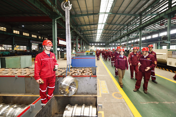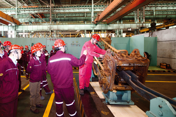 在沙鋼金工車間,員工用“小發明”讓設備維修效率翻倍,更讓維修成本“瘦身”。圖為觀摩團成員路過時,一線員工正用自製器具安裝軸承座。