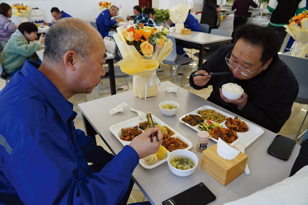 圖為勞模先進職工家屬體驗職工食堂的日常午餐,幫助他們感受企業大家庭的溫暖。