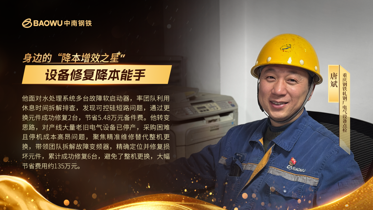 在重慶鋼鐵厚板產線,唐斌背著點檢包的身影時常穿梭於廠房之間。電氣室、液壓站、軋機平台……哪裏設備需要“診治”,他的身影就出現在哪裏,他的身影總是定格在設備故障的第一現場 —— 這個被工友稱為 “行走的備件醫生” 的年輕人,正用雙手為老舊設備注入新生,在修舊利廢的戰場上書寫降本傳奇。