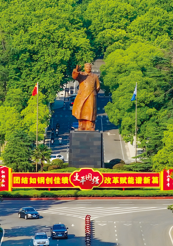 1958年9月13日毛主席視察武鋼,毛主席登上1號高爐爐台觀看1號高爐煉出的第一爐鐵水,這一天後被該公司定為武鋼廠慶日。圖為晨曦中的武鋼“913廣場”。
