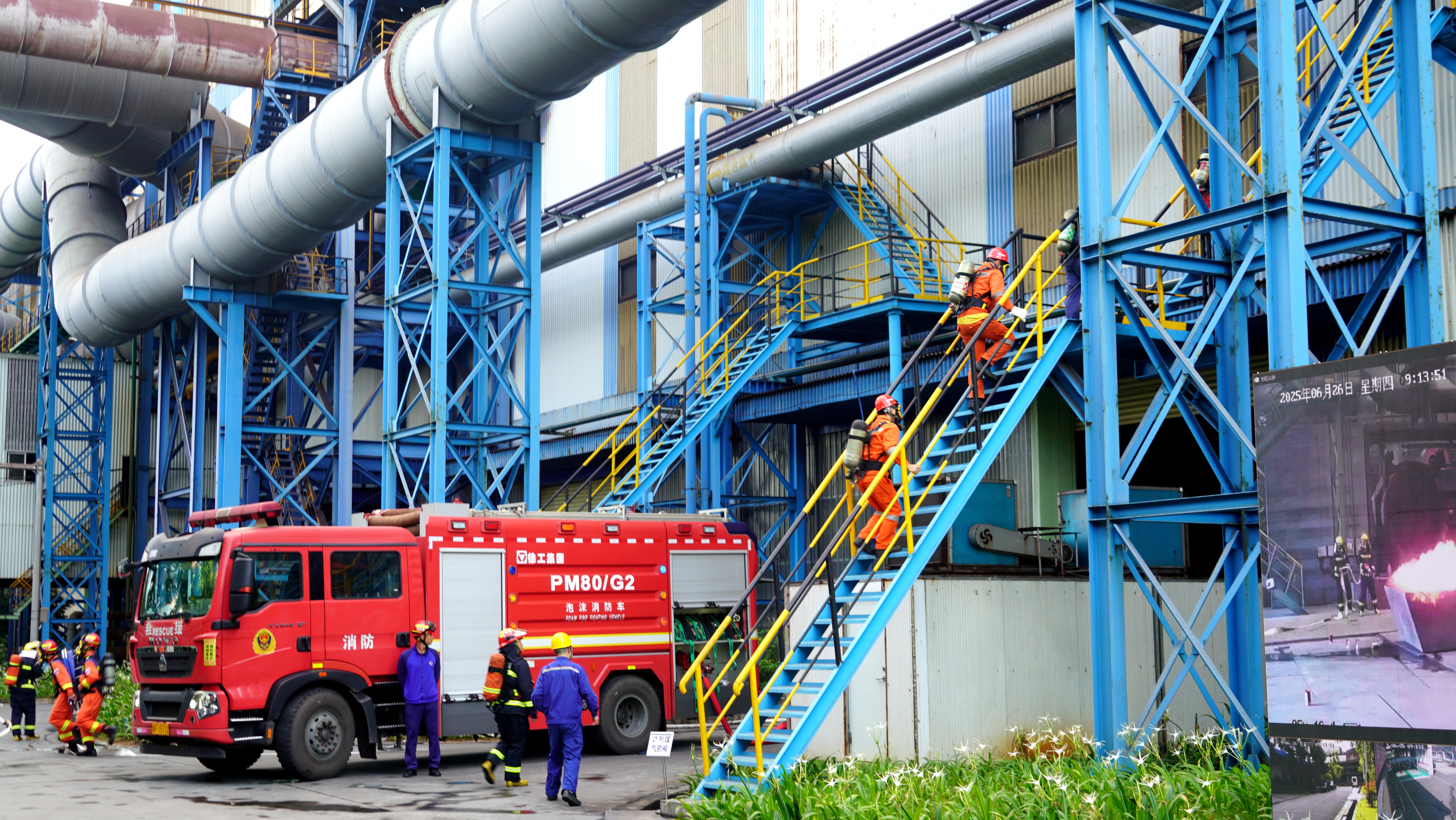 本次演練為模擬實戰演練,重點演練事故報告程序、預案的啟動和應急救援組織指揮程序、內容、方法。演練內容包括事故響應、現場警戒、人員疏散、受傷人員施救和滅火等。演練按流程逐步展開,公司應急大隊、煤氣防護站、醫療救護組等參演人員全副武裝參加演練,現場緊張有序、忙而不亂。