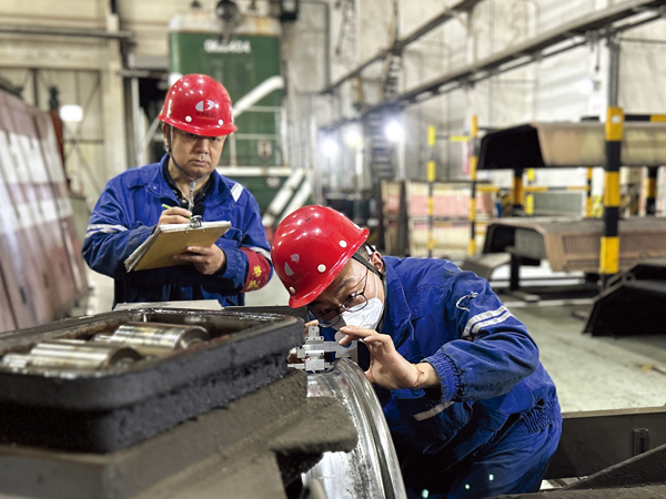 圖為傳動班職工正將輪緣測量尺卡在輪箍上,仔細讀數,為更換輪箍做準備。