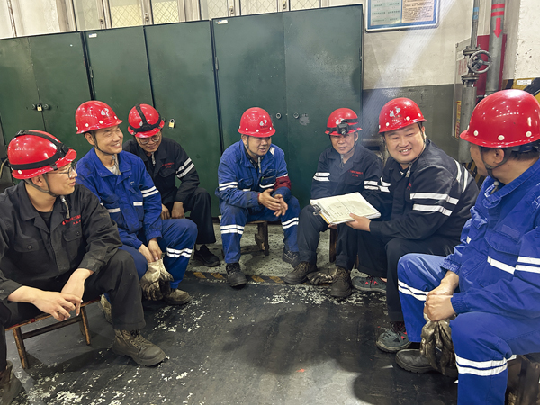 圖為工餘時間,班組部分成員聚在一起研討火車頭修理最佳方案。