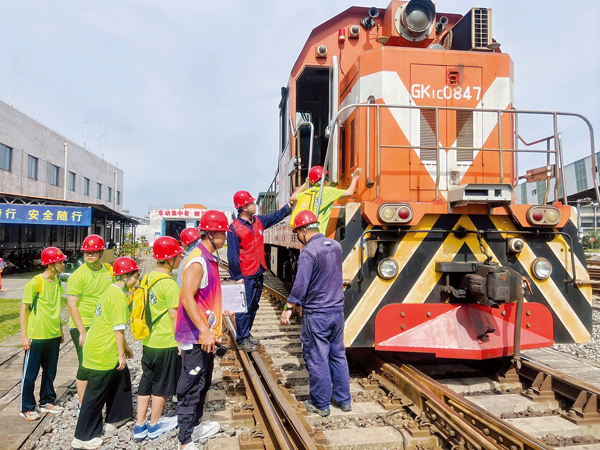 圖為廣西鋼鐵職工子女參觀運輸機車。