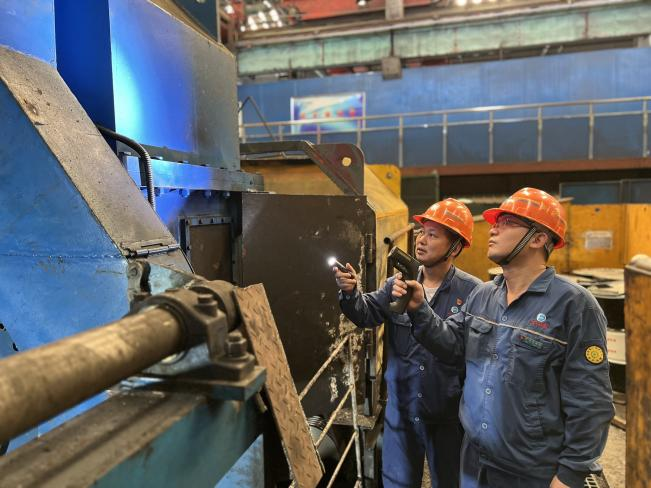 方大特鋼軋鋼廠設備部部長陽誌清帶著徒弟劉羅軍到軋鋼廠彈扁線進行設備巡檢 李亞洲 攝