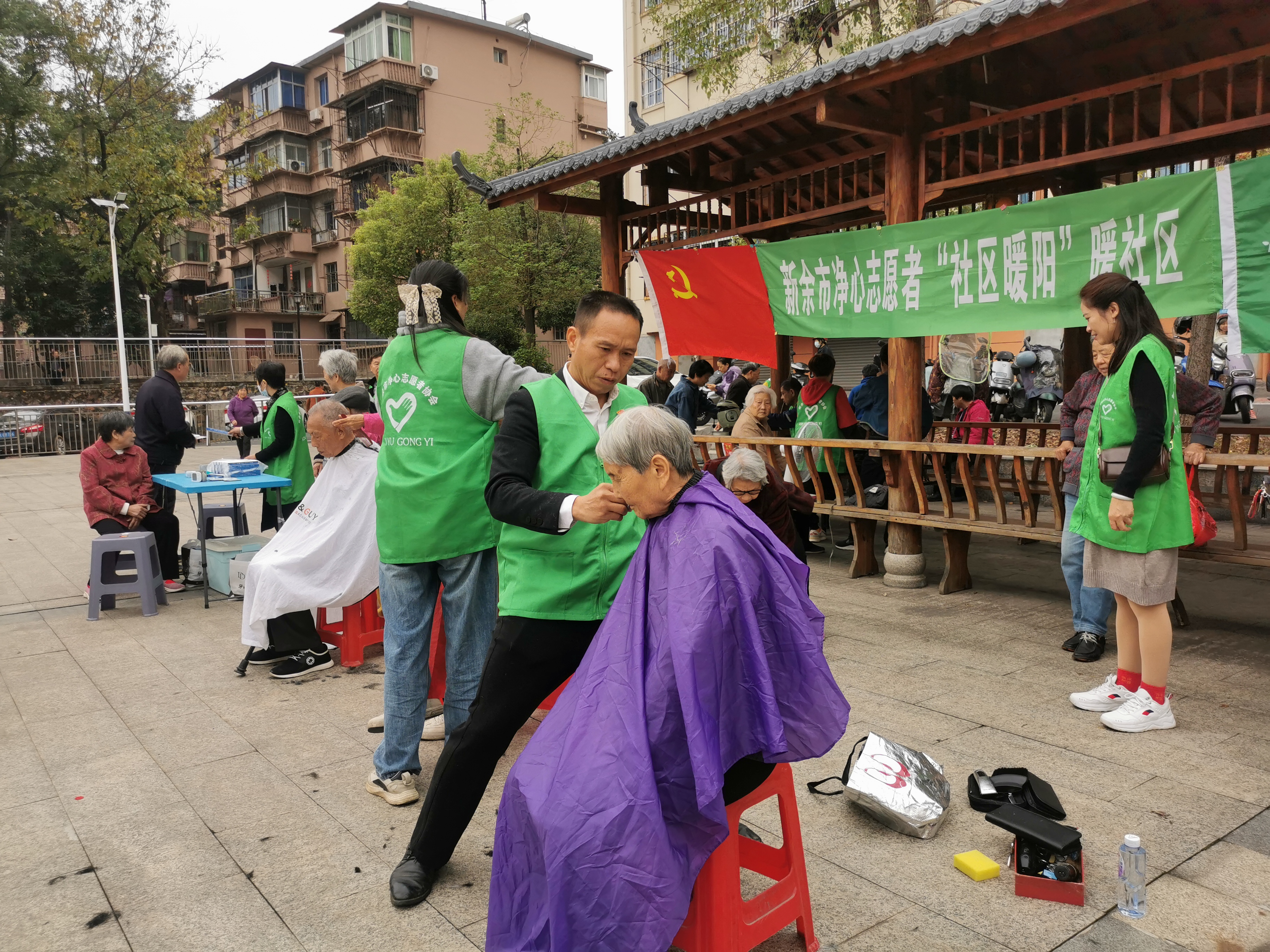 初冬的鋼城,處處有暖意。11月13日九時許,在新鋼文化社區廣場上黨旗飄揚,人頭攢動,一群身著紅馬甲的誌願者,用靈巧的雙手,熱忱地為居民朋友們理發、磨刀、修理小家電、忙得不亦樂乎。