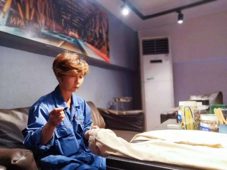 何仁美正在為同事縫補衣物