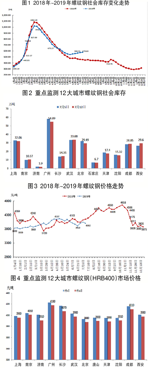 7月8日~7月12日,螺紋鋼社會庫存為578.66萬噸,環比上升3.94萬噸,升幅為0.68%。重點監測的12個城市庫存升降不一,其中廣州、北京下降較大,西安上升較大。