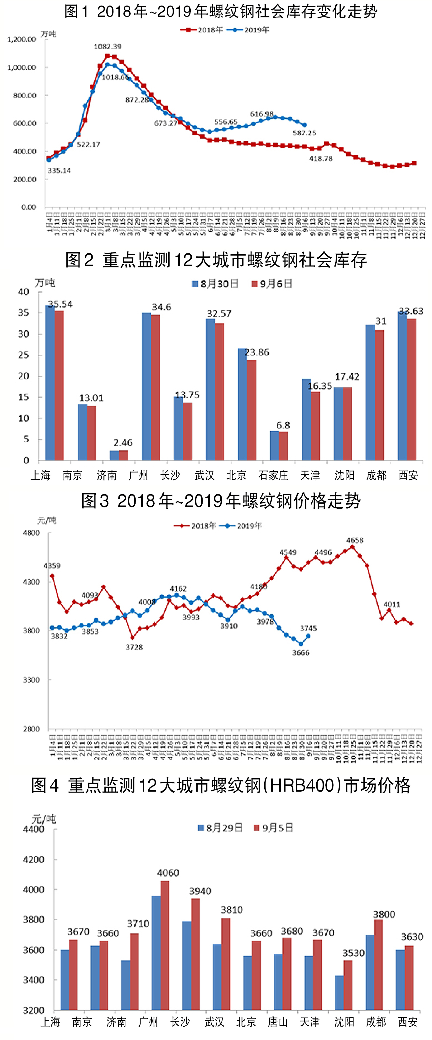 9月2日~9月6日,全國螺紋鋼平均價格為3745元/噸,環比上升79元/噸,升幅為2.15%。重點監測的12個城市價格全部上升,其中濟南、武漢等城市升幅較大。