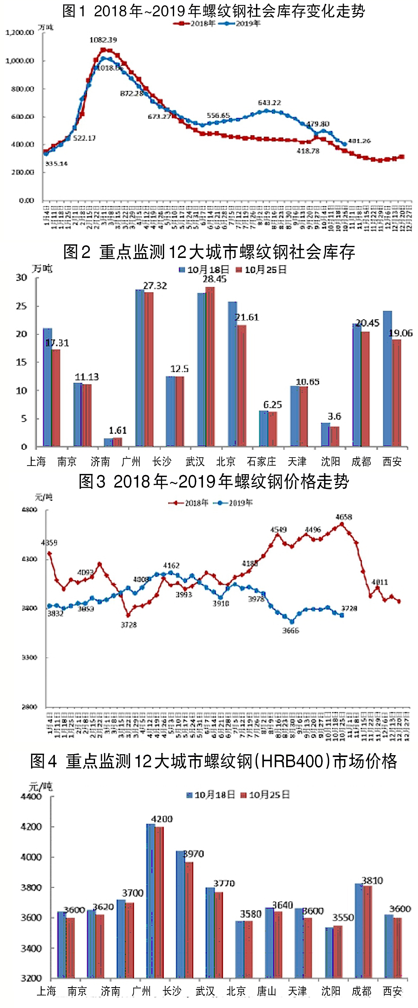 10月21日~10月25日,全國螺紋鋼平均價格為3728元/噸,環比下降25元/噸,降幅為0.68%。其中重點監測的12個城市價格跌漲互現,長沙、天津等跌幅較大,沈陽漲幅較大。