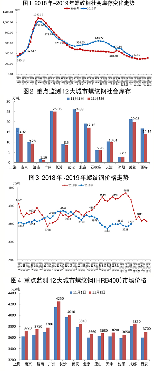 11月4日~11月8日,螺紋鋼社會庫存為343.10萬噸,環比下降29.07萬噸,降幅為7.81%。重點監測的12個城市庫存升降不一,其中上海、西安等城市庫存降幅較大,沈陽有所上升。