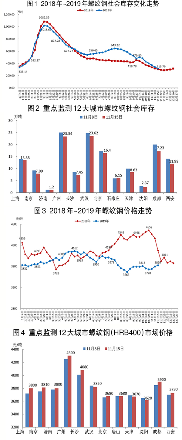 11月11日~11月15日,全國螺紋鋼平均價格為3829元/噸,環比上升33元/噸,升幅為0.86%。重點監測的12個城市價格漲跌互現,其中沈陽等城市價格降幅較大,上海、長沙等城市價格升幅較大。