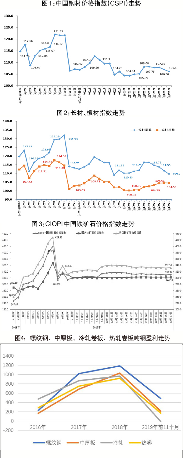 從具體數據(見圖1)來看,2019年初至4月末,鋼材價格受成本麵支撐大幅上漲。中國鋼材價格指數(CSPI)於4月29日漲至全年高點,為113.09點。4月末至8月末,國內鋼材市場供大於求的態勢明顯,市場預期回落,鋼材價格由升轉降,中國鋼材價格指數開始回落。8月末至10月末,鋼材價格漲跌互現,並於10月28日跌至全年低點,為104.28點。進入11月份,鋼價又迎來一波反彈行情,中國鋼材價格指數於11月25日漲至108.17點。至12月23日,中國鋼材價格指數回落至106.10點。總體來看,2019年鋼價呈現出“先揚後抑”的特點,期間雖有階段性反彈,但均未超過全年高點。