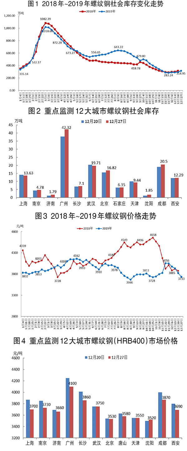 2019年12月23日~12月27日,螺紋鋼社會庫存314.95萬噸,環比上升19.02萬噸,升幅為6.43%。重點監測的12個城市庫存升降不一,其中武漢等城市降幅較大,廣州等城市升幅較大。