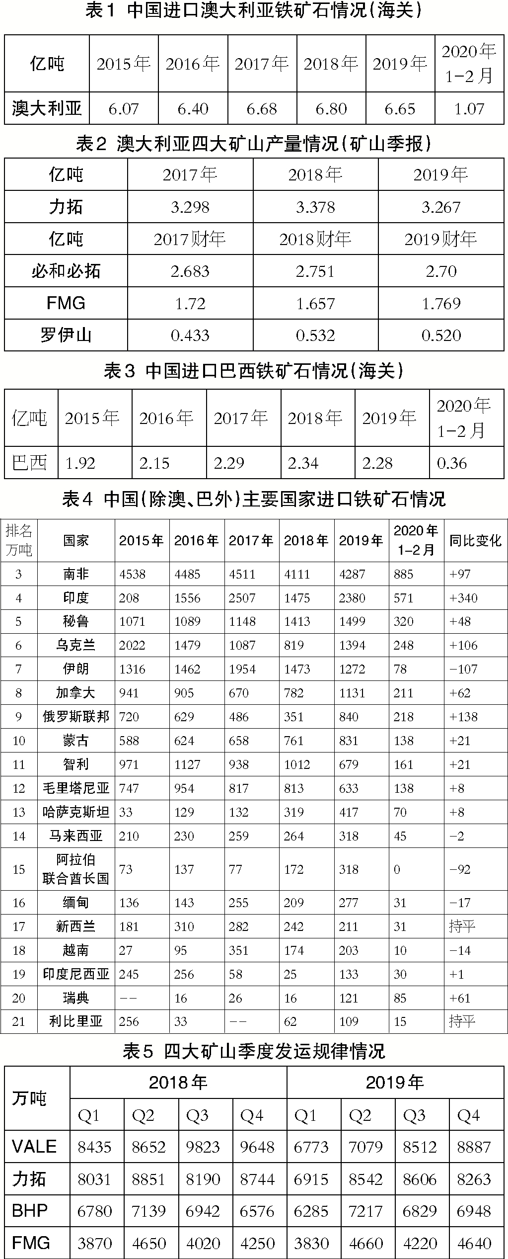 2019年,中國自巴西進口鐵礦石共計2.28億噸,同比減少600萬噸,占全年進口總量的21.33%(中國進口巴西鐵礦石情況見表3,02版)。根據礦山季報,2019年,淡水河穀鐵礦石產量為3.02億噸,同比下降21.5%,主要是潰壩事故影響9300萬噸產能。2020年1月~2月,中國自巴西進口鐵礦石3607萬噸,同比下降558萬噸,主要原因在於2019年淡水河穀潰壩事故對其供應的影響自當年4月份開始顯現,第一季度以消耗港口庫存為主,基數仍較高。而2020年1月~2月份,受連續暴雨天氣、港口頻繁檢修影響,其發運量出現回落。預計第二季度,淡水河穀發運量將隨著天氣的好轉逐步恢複。