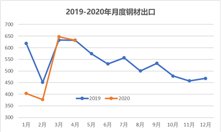 2019-2020年月度鋼材出口變化