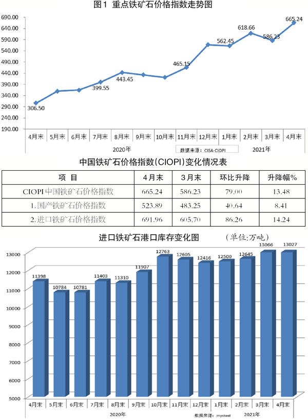 4月份,國內市場需求旺盛,鋼鐵生產仍保持較高水平,環比小幅上升;鐵礦石進口量和港口庫存環比小幅下降,鐵礦石價格由降轉升,總體呈高位運行態勢。