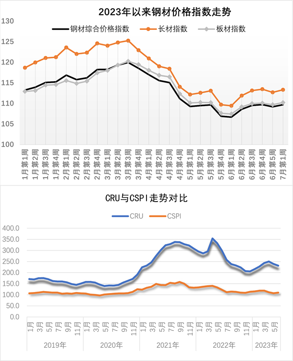 7月7日,中國鋼材價格指數(CSPI)為109.70點,周環比上漲0.51點,漲幅為0.47%;比去年底下降3.55點,降幅為3.13%;同比下降10.00點,降幅為8.35%。其中,長材價格指數為113.31點,周環比上漲0.62點,漲幅為0.55%;同比下降10.91點,降幅為8.78%。板材價格指數為110.21點,周環比上漲0.51點,漲幅為0.46%;同比下降9.13點,降幅為7.65%。從同比數據來看,長材價格指數降幅大於板材價格指數降幅0.78個百分點。(如圖所示)