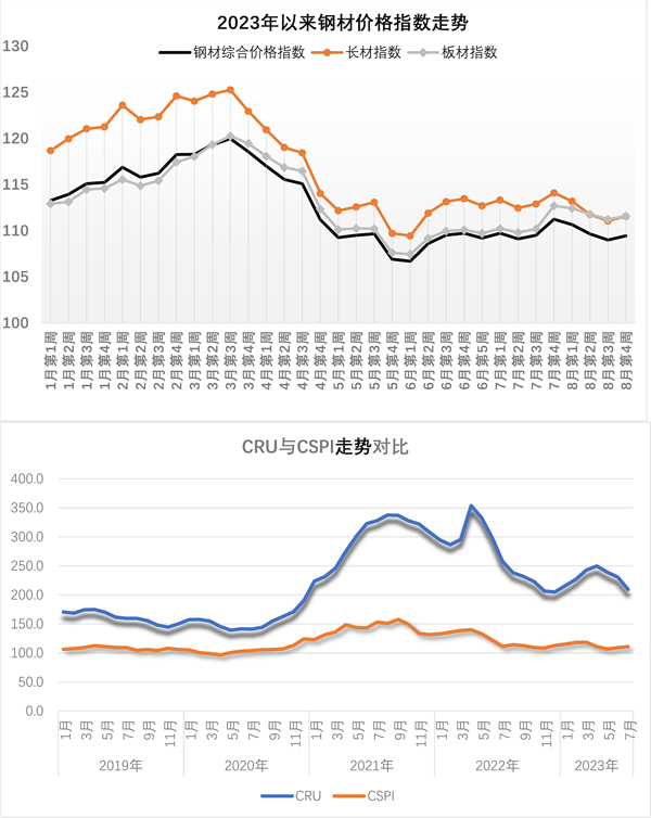 當周,中國鋼材價格指數(CSPI)為109.42點,周環比上漲0.51點,漲幅為0.46%;比上月末下降1.80點,降幅為1.62%;比去年底下降3.83點,降幅為3.38%;同比下降4.95點,降幅為4.33%。其中,長材價格指數為111.55點,周環比上漲0.51點,漲幅為0.46%;比上月末下降2.53點,降幅為2.22%;同比下降9.23點,降幅為7.64%。板材價格指數為111.58點,周環比上漲0.37點,漲幅為0.33%;比上月末下降1.10點,降幅為0.98%;同比下降1.36點,降幅為1.20%。
