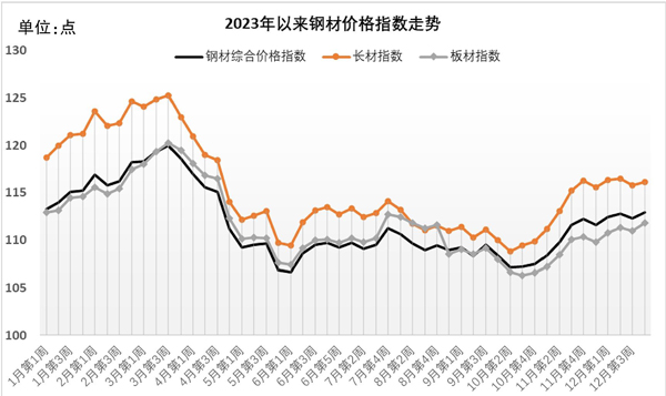 2023年12月25日—29日當周,國內鋼材價格指數小幅上漲,長材價格指數有所上漲,板材價格指數有所上漲。當周,中國鋼材價格指數(CSPI)為112.90點,周環比上漲0.37點,漲幅為0.32%;比2023年11月末上漲1.28點,漲幅為1.15%;比2022年底下降0.35點,降幅為0.31%;同比下降0.35點,降幅為0.31%。其中,長材價格指數為116.11點,周環比上漲0.37點,漲幅為0.32%;比2023年11月末上漲0.55點,漲幅為0.48%;比2022年底下降2.56點,降幅為2.16%;同比下降2.54點,降幅為2.15%。板材價格指數為111.80點,周環比上漲0.82點,漲幅為0.73%;比2023年11月末上漲1.99點,漲幅為1.81%;比2022年底下降1.11點,降幅為0.98%;同比下降1.11點,降幅為0.98%。