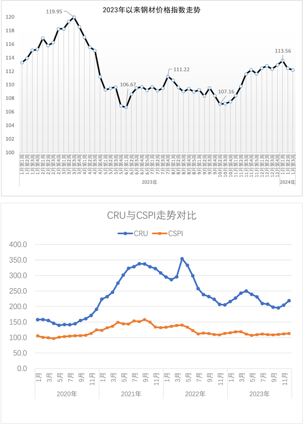 從國際市場來看,2023年12月份,CRU國際鋼材價格指數為218.7點,環比上漲14.5點,漲幅為7.1%,環比連續2個月回升;比2022年底上漲13.5點,漲幅為6.6%;同比上漲13.5點,漲幅為6.6%。其中,CRU長材價格指數為213.8點,環比上漲4.7點,漲幅為2.2%;同比下降20.6點,降幅為8.8%。CRU板材價格指數為221.1點,環比上漲19.3點,漲幅為9.6%;同比上漲30.3點,漲幅為15.9%。分地區來看,2023年12月份,北美地區價格指數為270.3點,環比上漲28.6點,漲幅為11.8%;歐洲地區價格指數為228.9點,環比上漲12.8點,漲幅為5.9%;亞洲地區價格指數為182.7點,環比上漲7.1點,漲幅為4.0%。