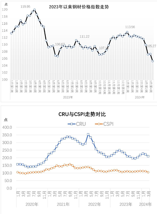 當周,中國鋼材價格指數(CSPI)為105.27點,周環比下降2.03點,降幅為1.89%;比上月末下降6.65點,降幅為5.94%;比去年底下降7.63點,降幅為6.76%;同比下降13.27點,降幅為11.19%。其中,長材價格指數為106.04點,周環比下降2.45點,降幅為2.26%;比上月末下降8.73點,降幅為7.61%;比去年底下降10.07點,降幅為8.67%;同比下降16.89點,降幅為13.74%。板材價格指數為104.51點,周環比下降1.88點,降幅為1.77%;比上月末下降6.35點,降幅為5.73%;比去年底下降7.29點,降幅為6.52%;同比下降14.93點,降幅為12.50%。