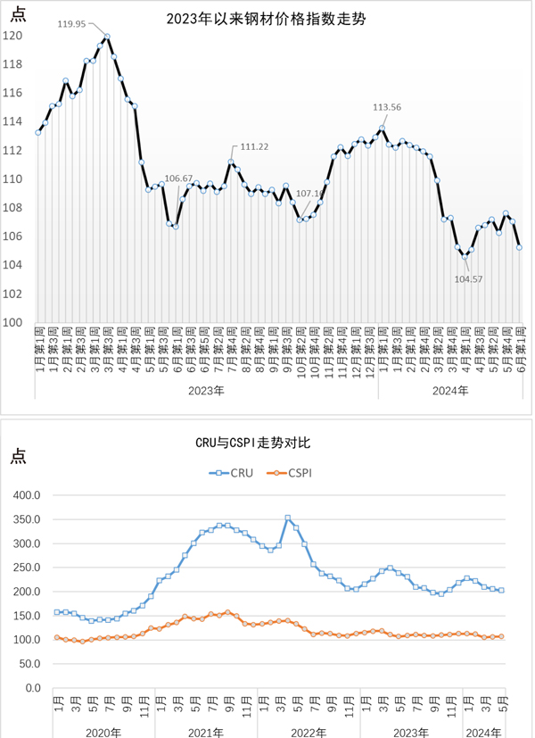 當周,中國鋼材價格指數(CSPI)為105.24點,周環比下降1.79點,降幅為1.67%;比上月末下降1.79點,降幅為1.67%;比去年底下降7.66點,降幅為6.78%;同比下降1.43點,降幅為1.34%。其中,長材價格指數為108.10點,周環比下降2.81點,降幅為2.54%;比上月末下降2.81點,降幅為2.54%;比去年底下降8.01點,降幅為6.90%;同比下降1.33點,降幅為1.22%。板材價格指數為103.25點,周環比下降1.26點,降幅為1.20%;比上月末下降1.26點,降幅為1.20%;比去年底下降8.55點,降幅為7.65%;同比下降4.18點,降幅為3.89%。