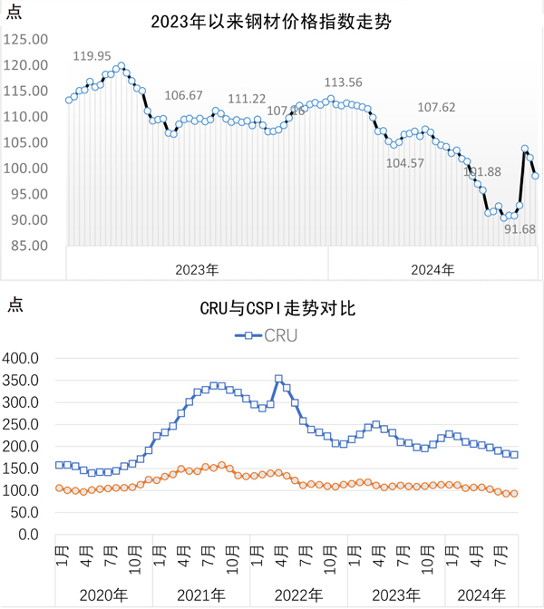 從國際市場來看,9月份,CRU國際鋼材價格指數為181.0點,環比下降2.3點,降幅為1.3%;比去年底下降37.7點,降幅為17.2%;同比下降16.8點,降幅為8.5%。其中,CRU長材價格指數為196.7點,環比下降1.3點,降幅為0.7%;比去年底下降17.1點,降幅為0.7%;同比下降10.6點,降幅為5.1%。CRU板材價格指數為173.1點,環比下降3.0點,降幅為1.7%;比去年底下降48.0點,降幅為21.7%;同比下降20.0點,降幅為10.4%。分地區來看,9月份,北美地區鋼材價格指數為208.3點,環比上漲3.8點,漲幅為1.9%;歐洲地區鋼材價格指數為210.7點,環比下降0.5點,降幅為0.2%;亞洲地區鋼材價格指數為148.4點,環比下降7.1點,降幅為4.6%。