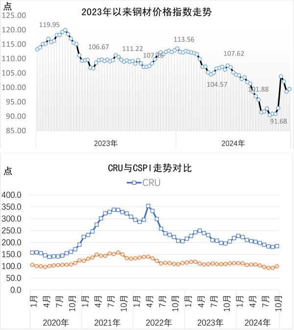 當周,中國鋼材價格指數(CSPI)為99.49點,周環比上漲0.92點,漲幅為0.93%;比9月末上漲6.64點,漲幅為7.15%;比去年底下降13.41點,降幅為11.88%;同比下降8.88點,降幅為8.19%。其中,長材價格指數為103.1點,周環比上漲0.82點,漲幅為0.80%;比9月末上漲5.33點,漲幅為5.45%;比去年底下降13.01點,降幅為11.20%;同比下降8.06點,降幅為7.25%。板材價格指數為96.78點,周環比上漲1.02點,漲幅為1.07%;比9月末上漲1.03點,漲幅為1.08%;比去年底下降15.02點,降幅為13.43%;同比下降10.45點,降幅為9.75%。