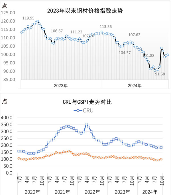 從國際市場來看,10月份,CRU國際鋼材價格指數為184.5點,環比上漲3.5點,漲幅為1.9%;比去年底下降34.2點,降幅為15.6%;同比下降11.0點,降幅為5.6%。其中,CRU長材價格指數為201.1點,環比上漲4.4點,漲幅為2.2%;比去年底下降12.7點,降幅為5.9%;同比下降7.7點,降幅為3.7%。CRU板材價格指數為176.2點,環比上漲3.1點,漲幅為1.8%;比去年底下降44.9點,降幅為20.3%;同比下降12.8點,降幅為6.8%。分地區來看,10月份,北美地區鋼材價格指數為208.3點,與9月份持平,同比下降3.0點,降幅為1.4%;歐洲地區鋼材價格指數為199.4點,比9月份下降11.3點,降幅為5.4%,同比下降15.1點,降幅為7.0%;亞洲地區鋼材價格指數為162.2點,環比上漲13.8點,漲幅為9.3%,同比下降13.6點,降幅為7.7%。