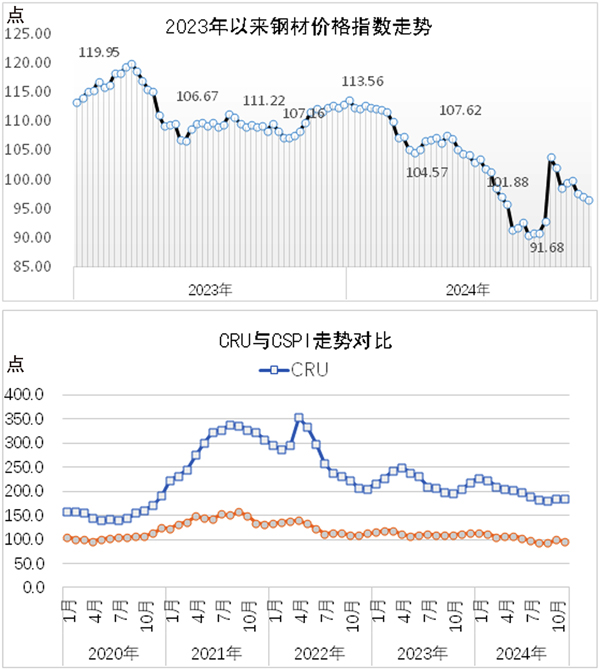 11月25日—29日當周,國內鋼材價格指數環比小幅下降。長材價格指數有所下降,板材價格指數小幅下降,長材價格跌幅繼續大於板材價格跌幅。