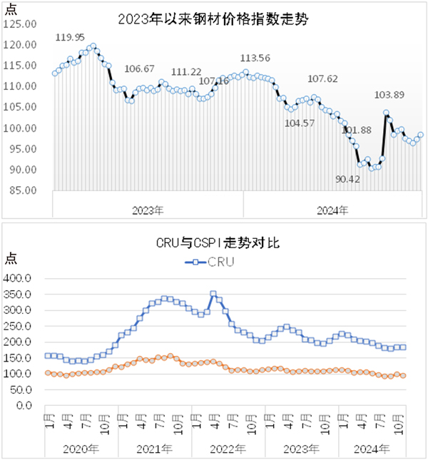 從國際市場來看,11月份,CRU國際鋼材價格指數為183.9點,環比下降0.6點,降幅為0.3%;比去年底下降34.8點,降幅為15.9%;同比下降20.3點,降幅為9.9%。其中,CRU長材價格指數為201.5點,環比上漲0.4點,漲幅為0.2%;比去年底下降12.3點,降幅為5.8%;同比下降7.6點,降幅為3.6%。CRU板材價格指數為175.2點,環比下降1.0點,降幅為0.6%;比去年底下降45.9點,降幅為20.8%;同比下降26.6點,降幅為13.2%。分地區來看,11月份,北美地區鋼材價格指數為205.7點,環比下降2.6點,降幅為1.2%,同比下降36.0點,降幅為14.9%;歐洲地區鋼材價格指數為204.9點,環比上漲5.5點,漲幅為2.8%,同比下降11.2點,降幅為5.2%;亞洲地區鋼材價格指數為159.5點,環比下降2.7點,降幅為1.7%,同比下降16.1點,降幅為9.2%。