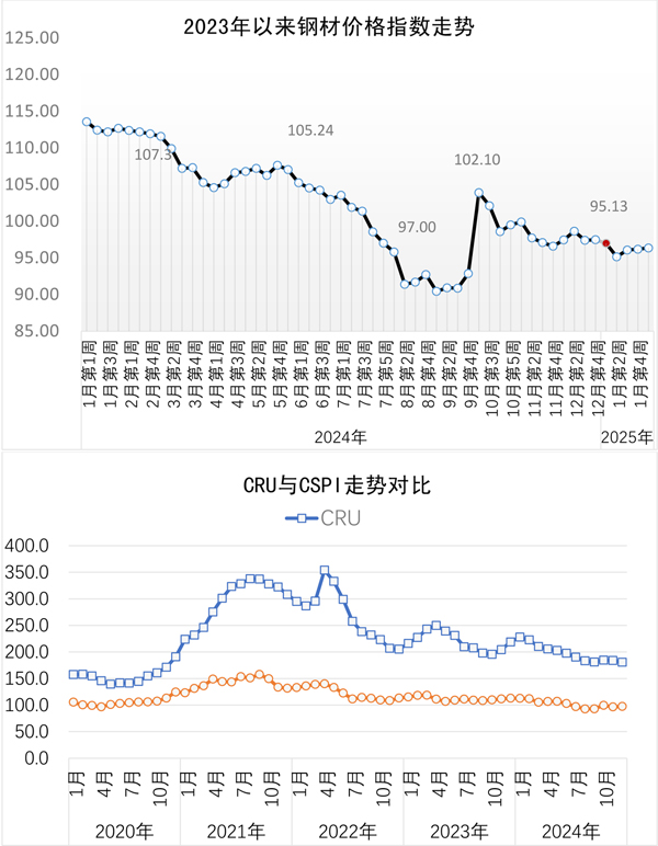 當周,中國鋼材價格指數(CSPI)為96.34點,周環比上漲0.16點,漲幅為0.17%;比上月末上漲0.17點,漲幅為0.18%;比2024年底下降1.13點,降幅為1.16%;同比下降16.04點,降幅為14.27%。其中,長材價格指數為99.01點,周環比上漲0.19點,漲幅為0.19%;比上月末上漲0.19點,漲幅為0.19%;比2024年底下降1.21點,降幅為1.21%;同比下降16.22點,降幅為14.08%。板材價格指數為94.50點,周環比上漲0.15點,漲幅為0.16%;比上月末上漲0.15點,漲幅為0.16%;比2024年底下降1.05點,降幅為1.10%;同比下降16.88點,降幅為15.16%。
