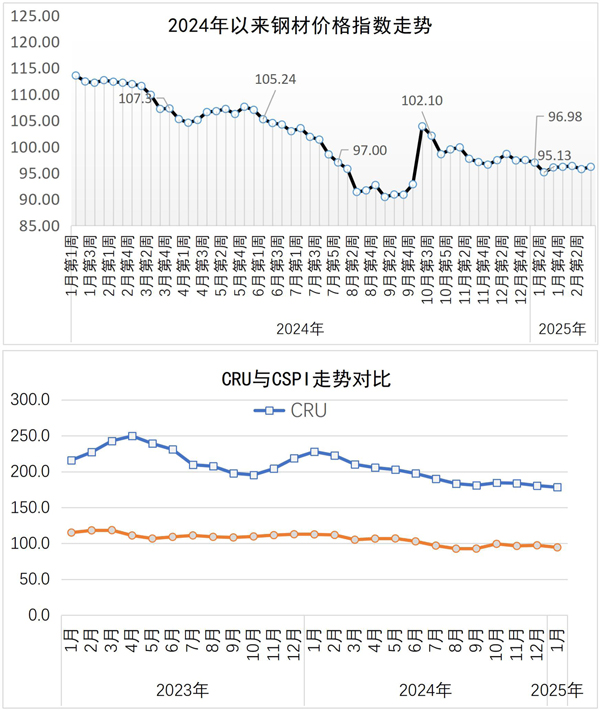 從國際市場來看,2025年1月份,CRU國際鋼材價格指數為178.3點,環比下降2.3點,降幅為1.3%;同比下降49.6點,降幅為21.8%。其中,CRU長材價格指數為194.9點,環比下降1.3點,降幅為0.7%;同比下降23.9點,降幅為10.9%。CRU板材價格指數為170點,環比下降2.8點,降幅為1.6%;同比下降62.2點,降幅為26.8%。分地區來看,2025年1月份,北美地區鋼材價格指數為203.6點,環比上漲0.6點,漲幅為0.3%,同比下降86.0點,降幅為29.7%;歐洲地區鋼材價格指數為201.5點,環比下降0.2點,降幅為0.1%,同比下降35.1點,降幅為14.8%;亞洲地區鋼材價格指數為150.5點,環比下降5.2點,降幅為3.3%,同比下降36.4點,降幅為19.5%。
