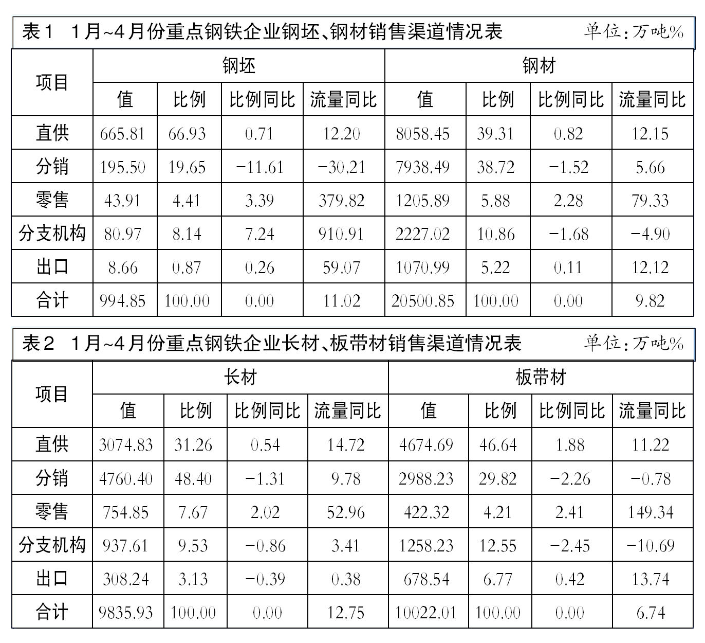 1月~4月份,重點鋼鐵企業鋼材按銷售渠道占比大小排序依次是:直供、分銷、分支機構、零售、出口。與2018年1月~4月份相比,鋼材零售占比提高最大,提高了2.28個百分點;分支機構占比下降最大,下降了1.68個百分點。1月~4月份,鋼材銷售量中零售增幅最大,同比上升79.33%。
