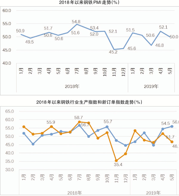 據中物聯鋼鐵物流專業委員會調查、發布的數據,5月份,鋼鐵行業PMI為50.0%,環比下降2.1個百分點。從分項指數來看,生產指數、原材料采購量指數、進口指數、購進價格指數均上升,新訂單、新出口訂單、原材料庫存指數等有所下降。數據顯示,5月份,鋼鐵生產繼續擴張,但內外市場需求增速下降,且企業原材料成本壓力加大。