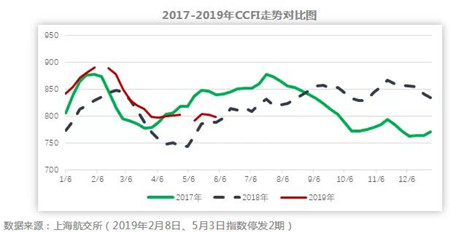 5月受中美貿易戰升級威脅,市場回升受阻。CCFI均值799點,環比減少0.1%,同比上漲3.7%。分航線看,亞歐線指數基本持平,歐洲和地中海線環比上漲0.4%和下跌0.7%;跨太平洋航線上漲,美西和美東線指數環比上漲4.8%和6.6%;亞洲航線指數下滑,日本、韓國和東南亞線環比下降1%、2.6和3.2%;南北航線普遍下跌,澳新、南非、南美和東西非線環比下滑6.9%、4.6%、6.7%和0.8%;此外,波紅線指數環比減少7.9%。1至5月CCFI均值831點,同比上漲4.6%。5月,SCFI均值747點,環比減少4%,同比減少2.8%;1至5月,SCFI均值820點,同比增長6.7%。