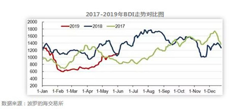 5月市場持續攀升。國際鐵礦石市場走高,價格穩步上升,5月7日突破100美元/dun,chujijinwuniandegaowei,kuangshangfahuoyiyuanzengqiang,aodaliyatiekuangshichukouqiangshihuisheng,baxichanghangxianhuinuan,daidongshichangfandanpangao。daxiyangliangshimaoyiwending,duishichangqidaozhichengzuoyong。BDI月底收報1096點,為1月20日以來的最高點。5月BDI均值1036點,環比上漲34.0%%,同比下跌19.9%。1至5月BDI均值841點,同比下跌29.3%。截至5月27日,2019年幹散貨船新增運力146艘、1337.8萬載重噸,拆解39艘、430.0萬載重噸;運力淨增107艘、907.8萬載重噸,增速仍保持在同期相對低位水平。