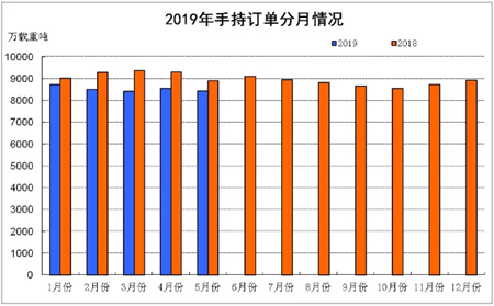 1~5月份,全國造船完工1666萬載重噸,同比增長1.4%。承接新船訂單1173萬載重噸,同比下降40%。5月底,手持船舶訂單8439萬載重噸,同比下降5.5%,比2018年底下降5.5%。