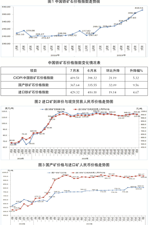 據中國鋼鐵工業協會監測,7月末,中國鐵礦石價格指數(CIOPI)為419.51點,環比上升21.19點,升幅為5.32%,升幅環比收窄6.00個百分點。其中,國產鐵礦石價格指數為367.64點,環比上升32.09點,升幅為9.56%,升幅環比加大0.77個百分點;進口鐵礦石價格指數為429.32點,環比上升19.14點,升幅為4.67%,升幅環比收窄7.05個百分點。