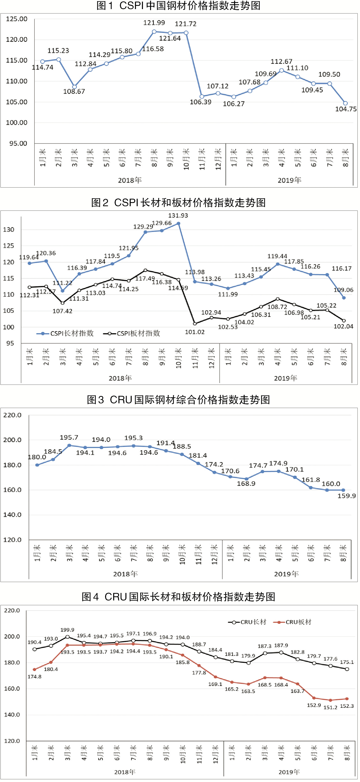 8月末,中國鋼鐵工業協會CSPI中國鋼材價格指數為104.75點,環比下降4.75點,降幅為4.34%;同比下降17.24點,降幅為14.13%。(見圖1)