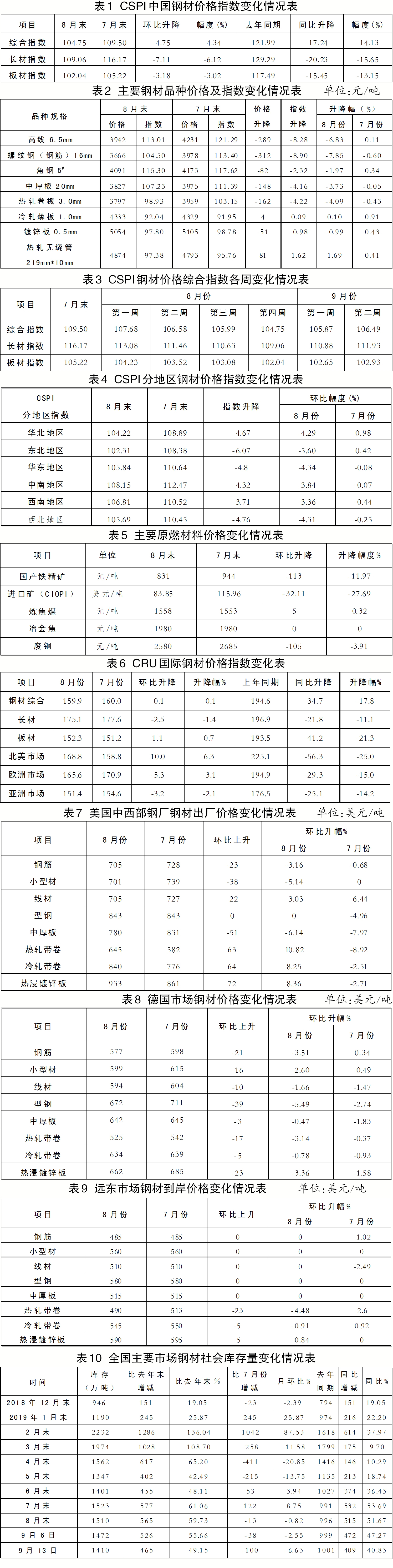 各周鋼材價格指數變化情況。8月份,CSPI國內鋼材價格指數連續4周下降。進入9月份,鋼材價格連續兩周小幅回升。(見表3)