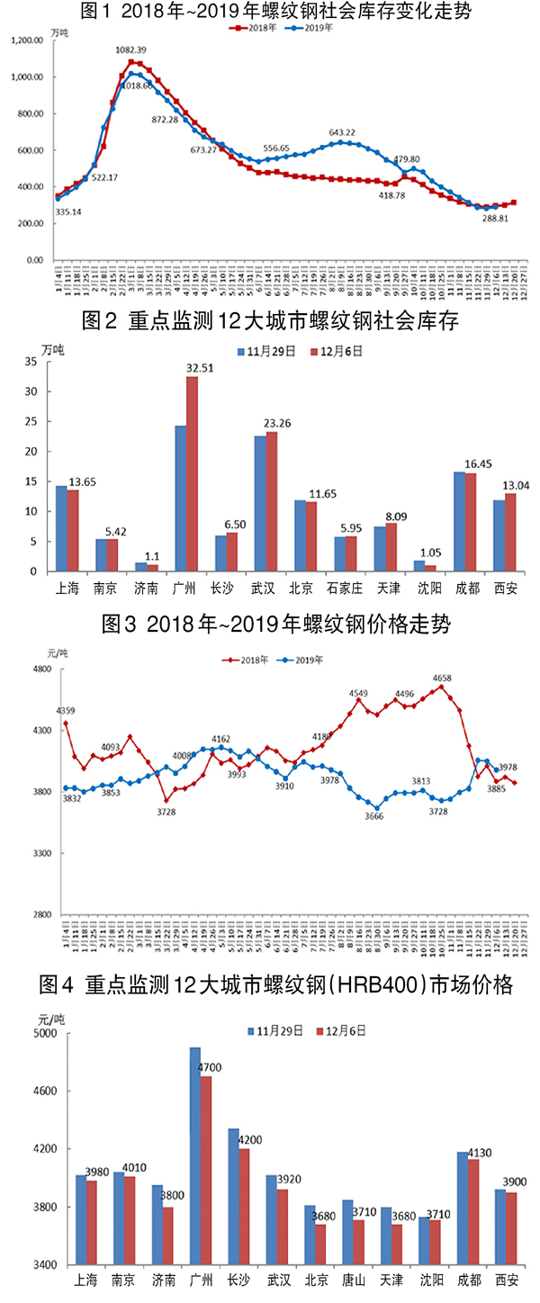 12月2日~12月6日,螺紋鋼社會庫存為288.81萬噸,環比上升5.57萬噸,升幅為1.97%。重點監測的12個城市庫存升降不一,其中沈陽、上海等城市庫存降幅較大,廣州等城市庫存升幅較大。