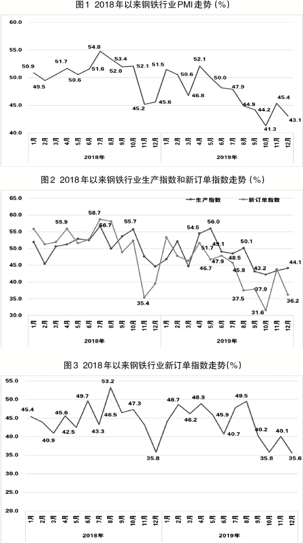 市場需求增速放緩,整體呈現供大於求的格局。2019年,鋼鐵行業新訂單指數均值為43.9%,比2018年下降7.1個百分點;積壓訂單指數均值為47.1%,比2018年下降2.1個百分點,表明市場需求有所減少。從全年走勢看,2019年1月~4月份,鋼材需求相對強勁,房地產新開工麵積增速維持高位,基礎投資建設力度也較大,鋼鐵行業新訂單指數均值為49.8%。進入2019年5月份後,鋼材需求逐步減少。一方麵,房地產提振效果有所減弱,鋼材需求進入調整階段;另一方麵,汽車需求全年保持弱勢,僅第四季度有所恢複。受國際貿易摩擦的影響,鋼材出口也受到一定影響。2019年,鋼鐵行業新出口訂單指數均值為43.6%,比2018年下降1.8個ge百bai分fen點dian。受shou上shang述shu因yin素su影ying響xiang,鋼gang材cai需xu求qiu後hou勁jin略lve顯xian不bu足zu,供gong大da於yu求qiu的de情qing況kuang逐zhu漸jian成cheng為wei常chang態tai。麵mian對dui需xu求qiu不bu足zu的de情qing況kuang,鋼gang廠chang采cai購gou意yi願yuan也ye有you所suo下xia降jiang。2019年,鋼鐵行業采購量指數均值為46.1%,比2018年下降7.0個百分點。