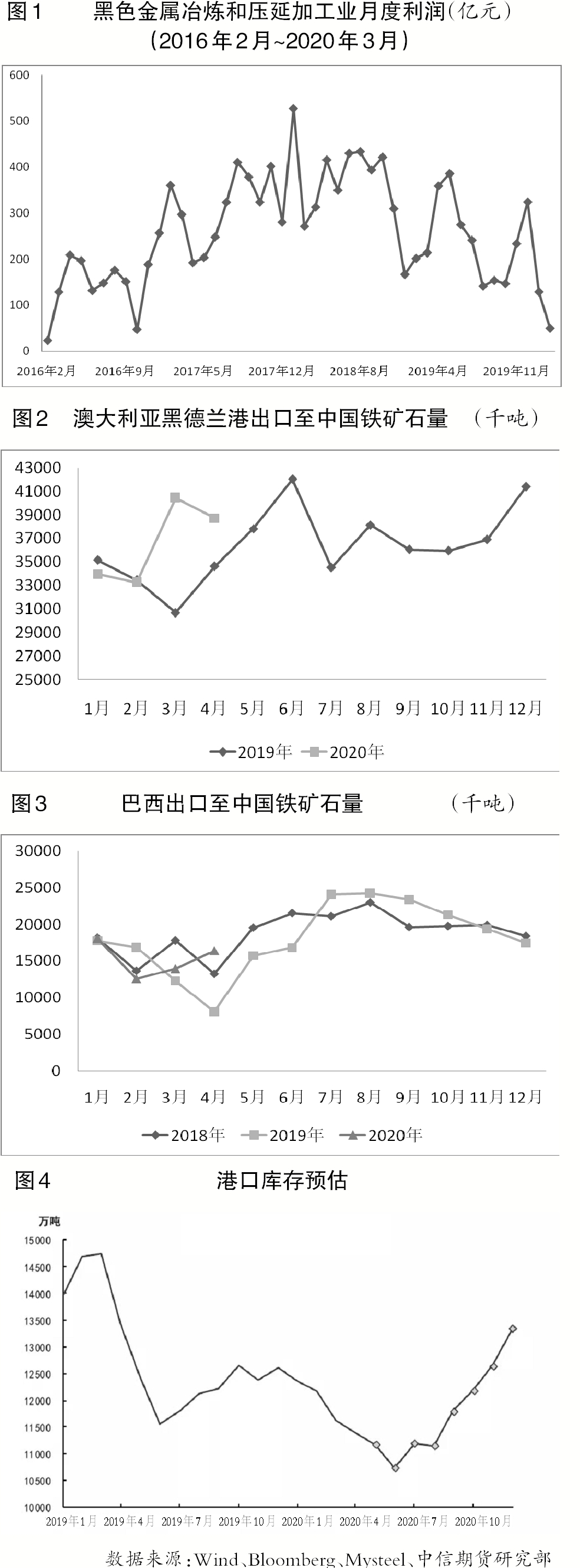 整體上,預計2020年國外礦山供應情況仍將好於2019年nian。根gen據ju前qian期qi澳ao大da利li亞ya與yu巴ba西xi發fa運yun量liang和he海hai漂piao資zi源yuan情qing況kuang推tui算suan,後hou期qi鐵tie礦kuang石shi到dao港gang量liang會hui有you所suo增zeng加jia,尤you其qi是shi淡dan水shui河he穀gu將jiang增zeng加jia下xia半ban年nian發fa運yun量liang以yi實shi現xian年nian度du銷xiao售shou目mu標biao。與yu此ci同tong時shi,疫yi情qing對dui全quan球qiu終zhong端duan需xu求qiu的de影ying響xiang將jiang進jin一yi步bu傳chuan導dao,影ying響xiang全quan球qiu鋼gang鐵tie生sheng產chan和he鐵tie礦kuang石shi需xu求qiu;國內產能利用率幾近飽和,鐵礦石需求增長有限。在對今年下半年鐵礦石供增需減的預期下,鐵礦石港口庫存將重新增加(見圖4)。