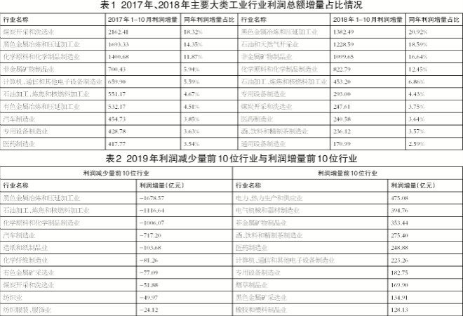 2019年工業利潤同比出現下降,根據同口徑比較推算出各行業的利潤增(減)量,並據此列出利潤減少量前10位行業、利潤增量前10位行業(見表2)。黑色金屬冶煉和壓延加工業、石油加工煉焦和核燃料加工業、化學原料和化學製品製造業的2019年利潤同比減少量均在1000億元以上,黑色金屬冶煉和壓延加工業減少量更是高達1678.57億元。汽車製造業連續2年利潤總額同比出現下降,2018年同比減少了283.04億元,2019年同比減少了717.2億元。而2017年僅有3個行業利潤同比下降,其中減少量最大的行業是電力熱力生產和供應業,同比減少了791.57億元;2018年有7個行業利潤同比下降,其中減少量最大的行業是汽車製造業。2019年利潤同比減少的行業數量高達11個,且有3個行業減少量超過1000億元,這是2017年~2018年所沒有的現象,這表明2019年整個工業盈利水平出現下降,其中鋼鐵、石油製品、化學製品等2017年、2018年利潤增量較大的行業在2019年出現了大幅下降的現象。