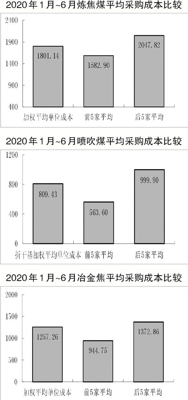 1月~6月份,對標企業冶金焦平均采購成本最低的前5家企業的加權平均采購成本為1582.90元/噸,比對標企業平均采購成本低218.24元/噸,降低幅度為12.12%;而采購成本最高的5家企業的加權平均采購成本為2047.82元/噸,比對標企業平均采購成本高246.68元/噸,高於平均采購成本的13.70%。