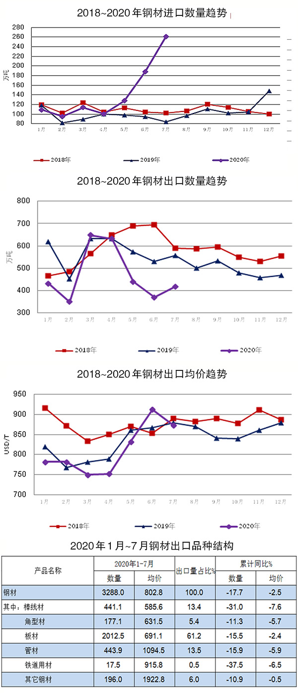 疫yi情qing期qi間jian,海hai外wai鋼gang鐵tie企qi業ye停ting工gong停ting產chan幅fu度du不bu如ru其qi需xu求qiu下xia降jiang幅fu度du,導dao致zhi產chan品pin價jia格ge走zou低di,貿mao易yi商shang和he下xia遊you企qi業ye采cai購gou進jin口kou產chan品pin意yi願yuan增zeng強qiang,推tui動dong進jin口kou量liang持chi續xu增zeng長chang。7月份,鋼材進口均價為664.0美元/噸。