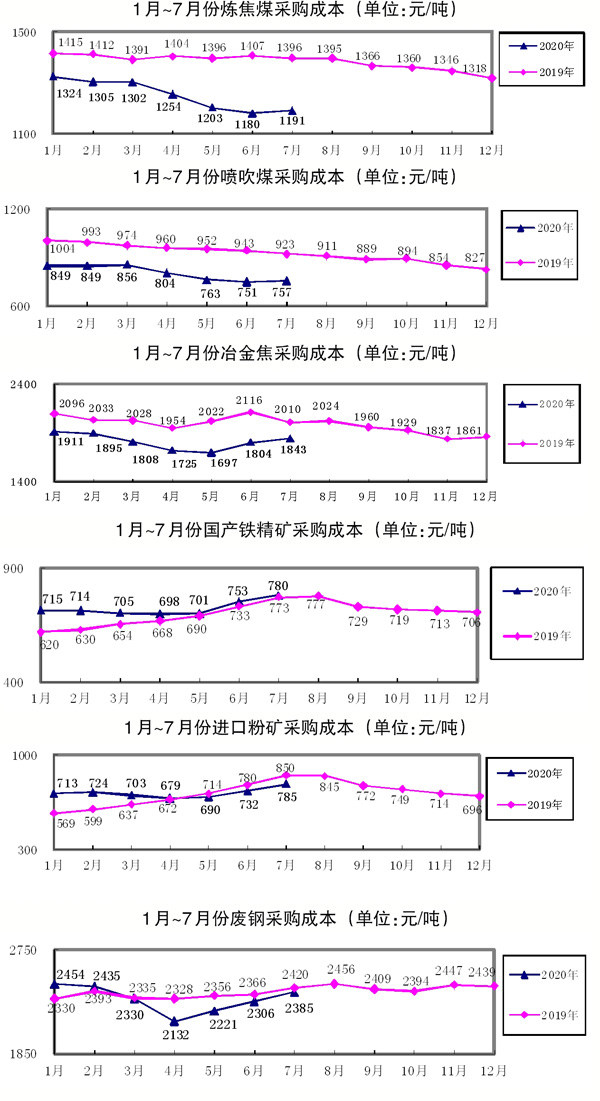 1月~7月份,煉焦煤累計采購成本同比下降11.19%;冶金焦同比下降11.31%;國產鐵精礦同比升高5.87%,進口粉礦同比升高3.87%;廢鋼同比下降2.15%。